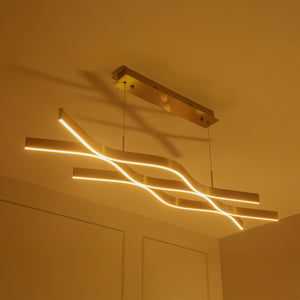 The Ocean Waves LED Chandelier features a stunning flow-inspired design that brings elegance and motion to your interiors. Crafted with brass-finished metal and smooth acrylic, the light creates a warm golden glow that beautifully enhances your space. Its wavy linear form resembles gentle ocean waves, adding a modern artistic touch. Perfect for living rooms, dining rooms, and bedrooms, this chandelier transforms any room into a sophisticated and relaxing ambiance.