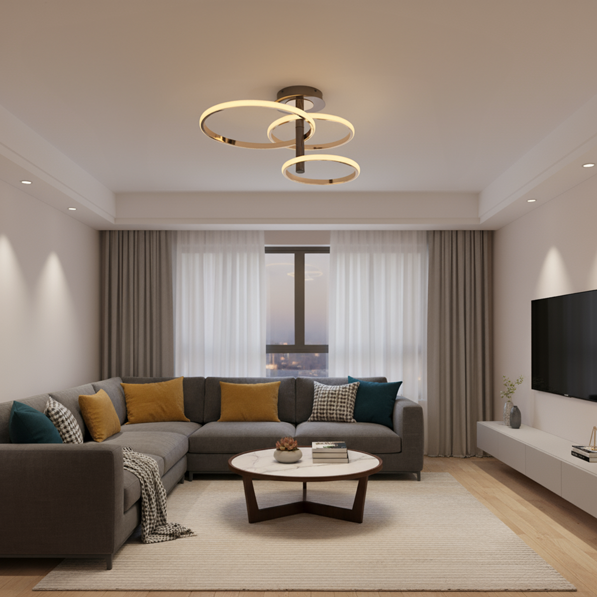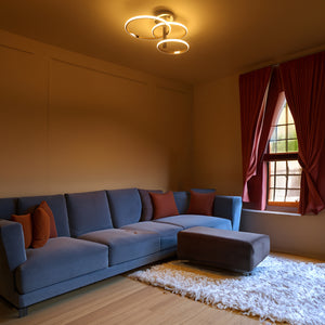 The Simplicity 3 Ring (3 Colour) LED Chandelier is a striking centerpiece that enhances any space with its modern design. Crafted from black and rose gold-finished metal with acrylic elements, this chandelier exudes elegance and style. It features three adjustable color options-warm, natural and cool white-that can be changed with a switch toggle, allowing you to create the perfect ambiance. Ideal for the living room, dining area, and bedroom, this chandelier adds a luxurious and contemporary touch to any interior.