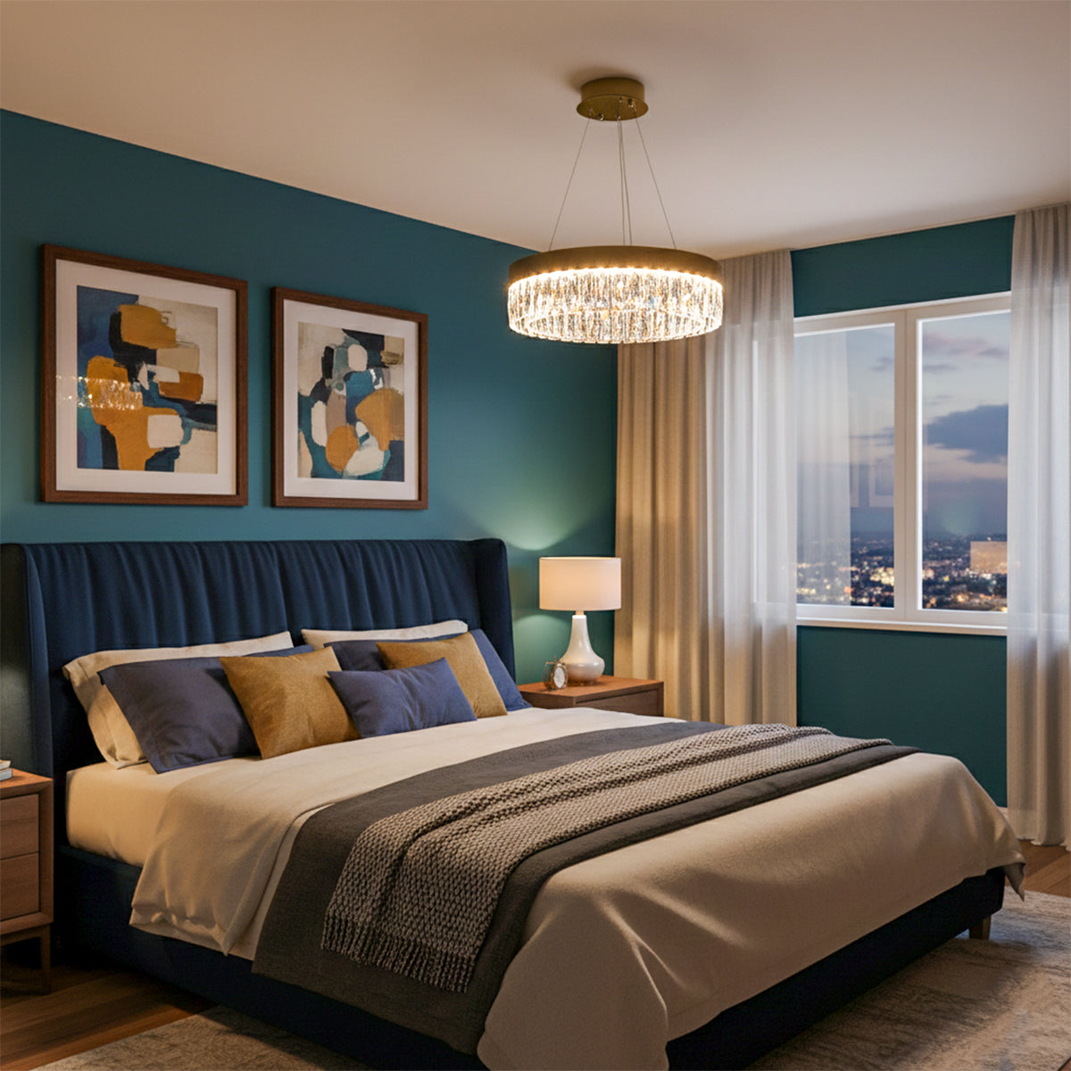 🛏️ The Master Bedroom: Position it above the bed to evoke a boutique-hotel feel, using the warm dimming feature to wind down in a serene, golden atmosphere.