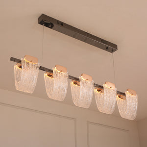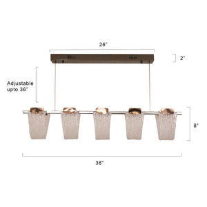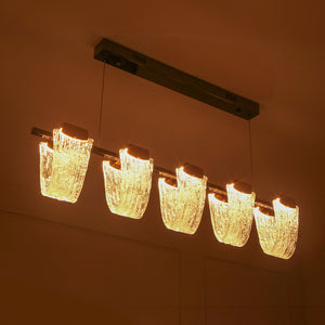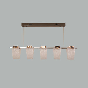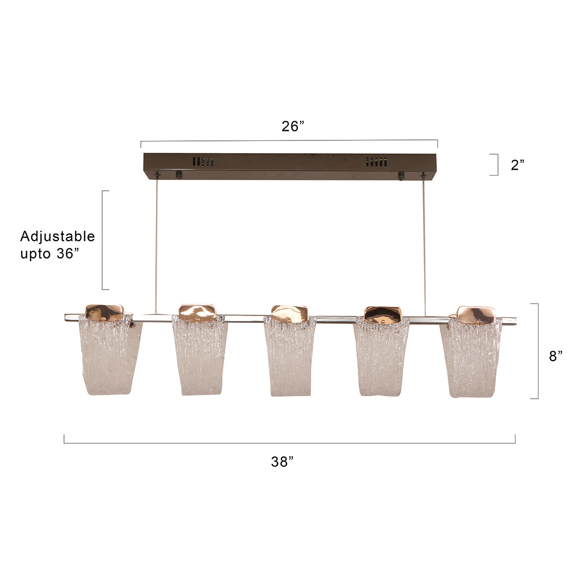 The Journey To Moon LED Chandelier brings a striking and elegant glow to any interior. Designed with a rose gold-finished metal frame, a sturdy black metal base, and beautifully crafted textured glass shades, it creates a warm and luxurious ambiance. The cascading glass design enhances the light’s charm, making it visually impressive from every angle. Perfect for the living room, dining room, and bedroom, this chandelier adds modern sophistication and a graceful decorative presence to your space.