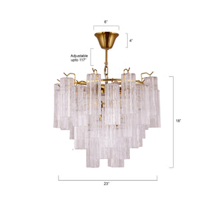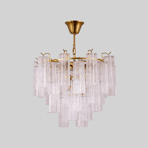 The design features tiers of clear textured glass mounted on a warm brass-finish frame. Unlike frosted glass that dims the light, these clear textured panels fracture the light into a brilliant, sparkling display, filling your room with brightness and high-end drama.
